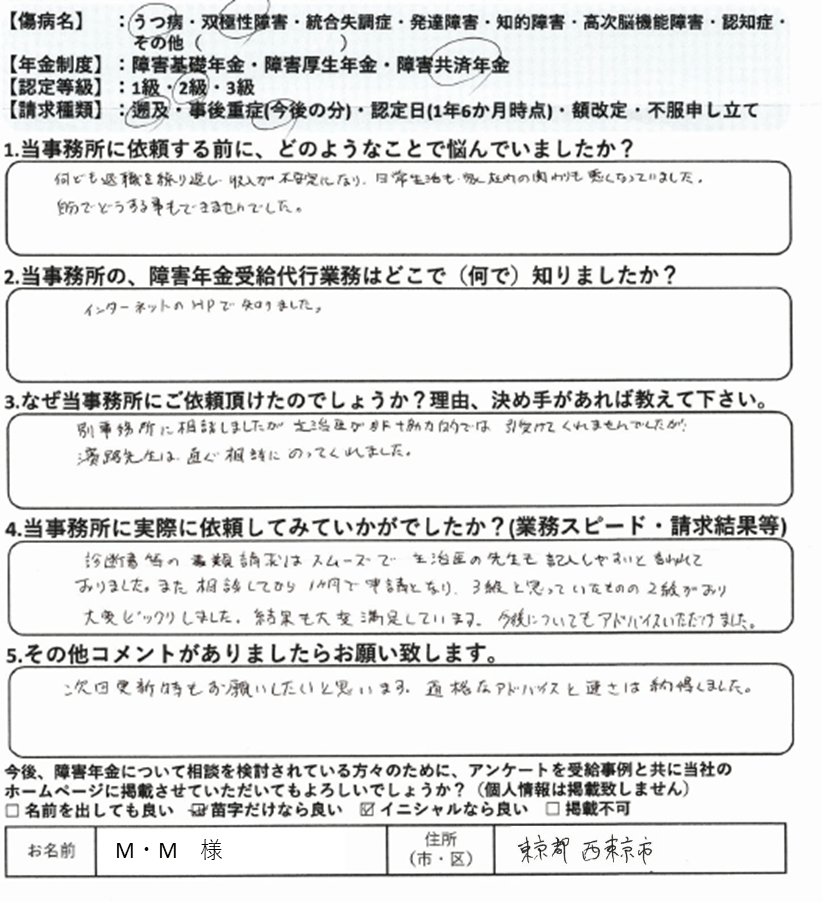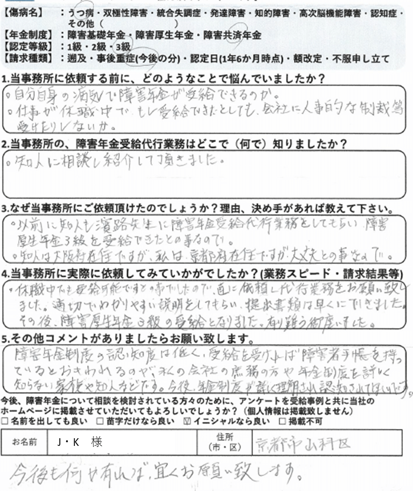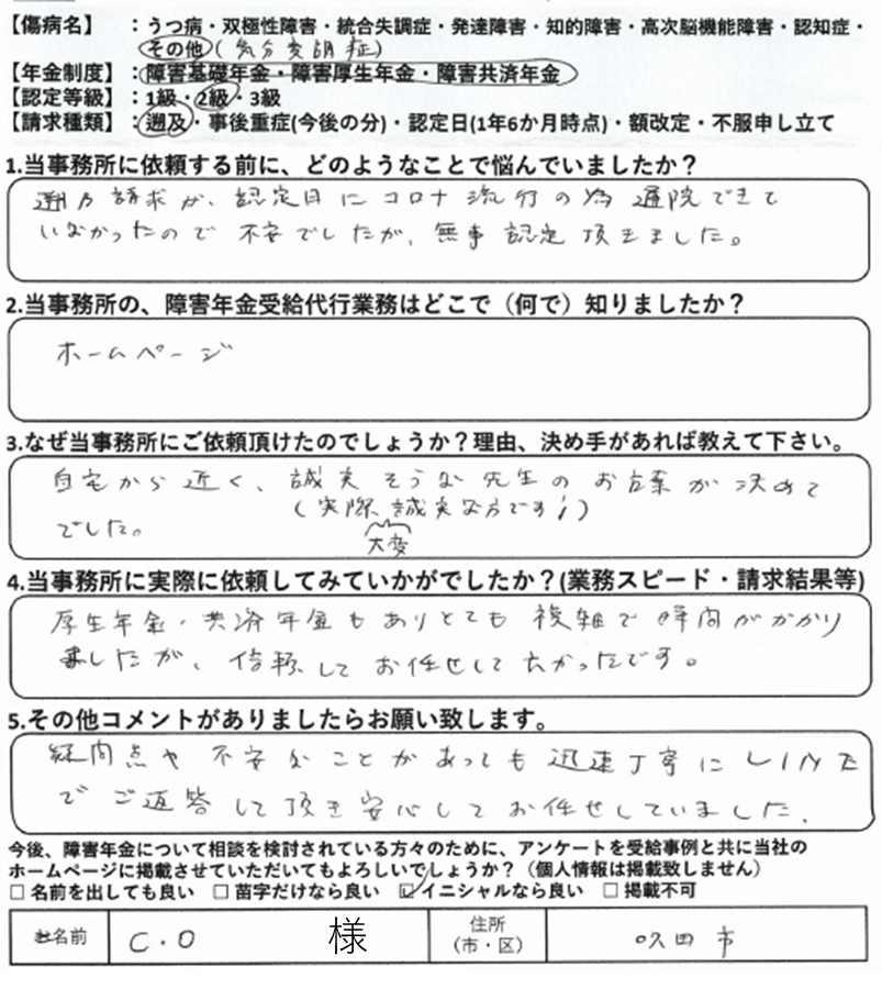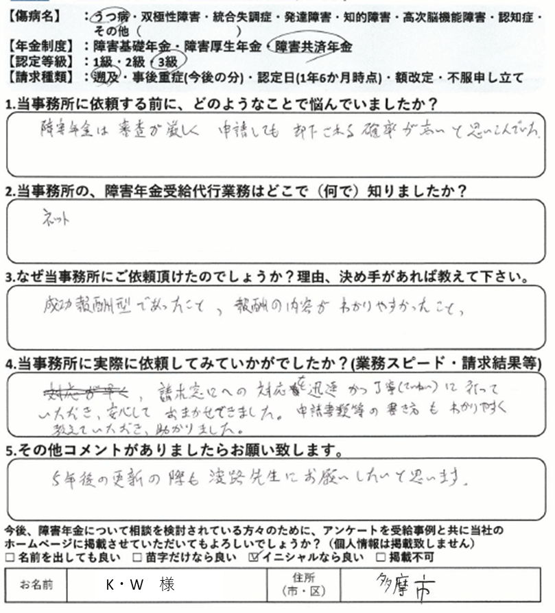 初回の請求をご自身で行って不支給となった場合、審査請求や再審査請求で覆すのは非常にハードルが上がります。これは初回の請求時に提出した診断書や病歴・就労状況等申立書の記載は、その後の審査請求でも永遠についてまわる為です。当事務所では納得いかない結果については審査請求についても積極的に対応しておりますが、審査請求にもつれ込まず、初回の請求で認定されるに越したことはありません。