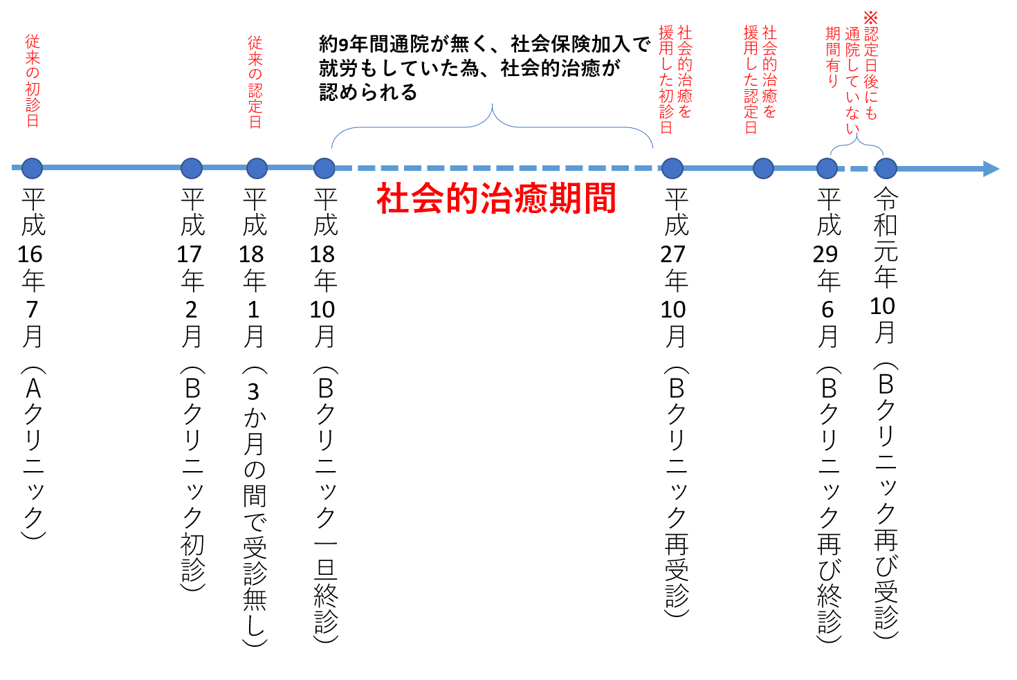 ※社会的治癒が認められたことにより認定日請求が可能となりましたが、その認定日後にも通院が2年4か月程度空いた期間がありましたので、不該当の可能性もあったと思います。